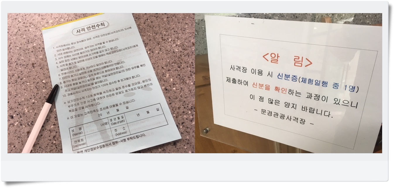 그런것이 아닌! 사격중 지켜야할 사항에 대해 숙지를 하구, 지도해주시는 선생님 말씀을 잘 따르겠다는 내용이라는 것.. ㅎㅎ 문경관광사격장에서는 클레이 사격, 권총사격, 공기소총 사격을 체험 할수 있으며, 생각했던 요금보다 저렴하고, 초보자도 쉽게 접할수 있도록 1대1 지도 해주신다고 하여 모든 사격을 체험해 보기로 했습니다~