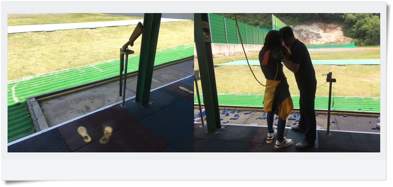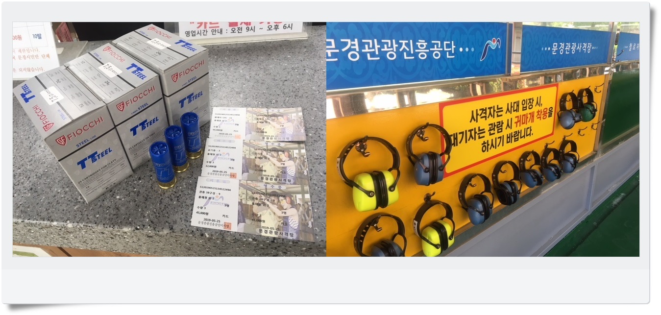 입구에 있는 안내 문구에 따라 귀마개 착용은 필수 !! 이곳이 클레이 사격장! 바닥에 쌓인 탄피 보세요... ㅎ 바닥에 그려진 발모양에 서서 "아!" 라구 외치면 접시가 날아가더라구요~ 완전 신기해 하고있는데 알고보니 지도선생님께서 누르고 계셨던것...ㅎ 또한, 여성분들을 위한 어깨 보호대도 있어 부담없이 즐길수 있었습니다~ (남성분도 필요시 착용 가능하다구 하네요~)