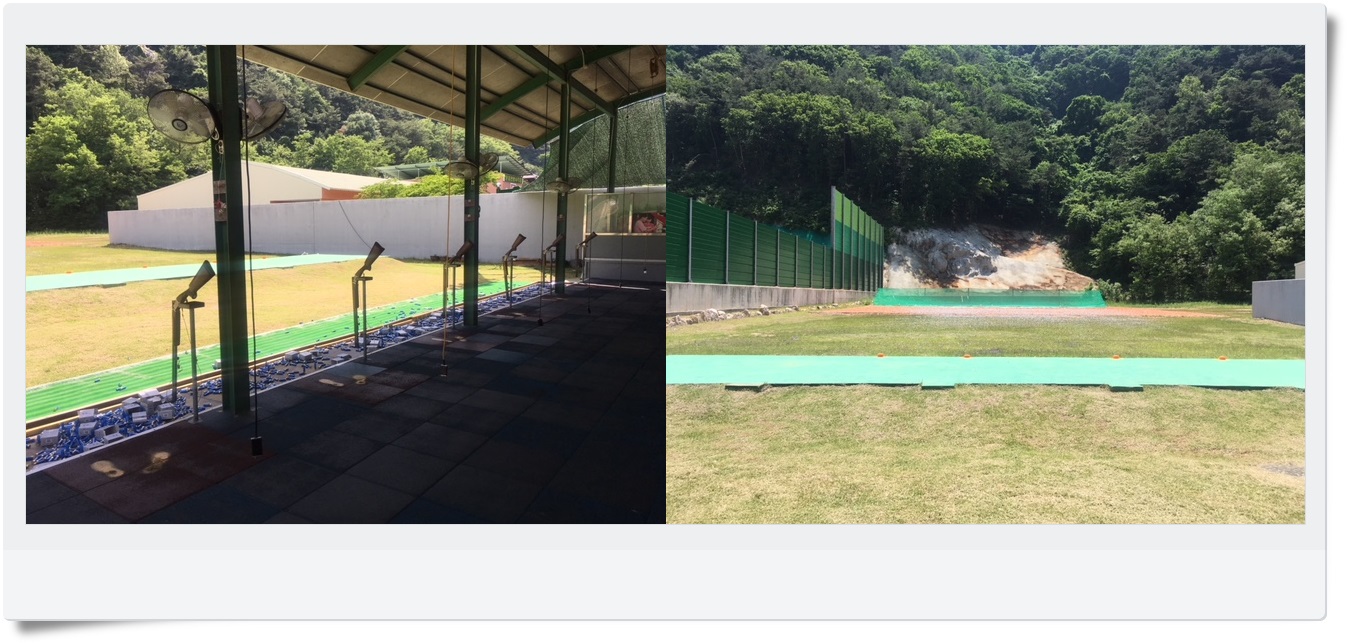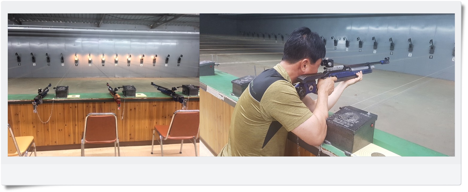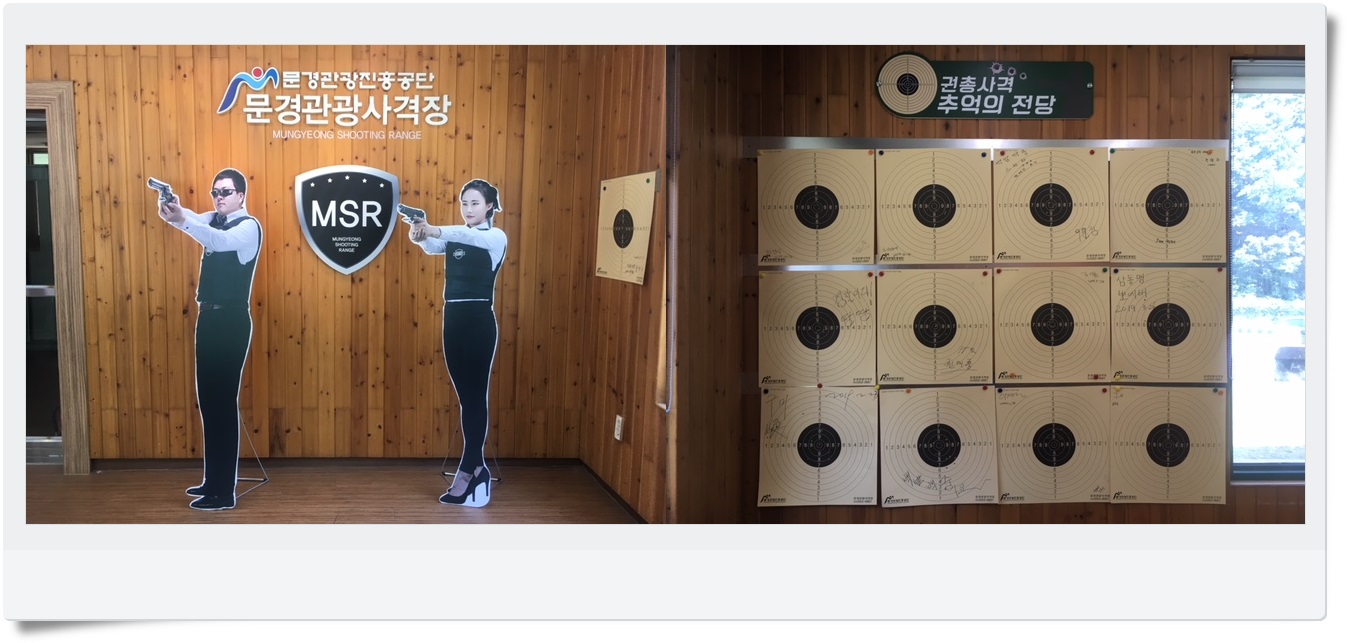 이곳은 권총, 공기총 사격장! 클레이는 실외사격. 권총,공기소총은 실내사격. 권총사격장 내부 모습입니다. 한쪽에는 기념촬영을 할 수 있도록 포토존이 있으며, 다른 한쪽은 사격표적지를 기념 할수 있는 게시대도 있네요 ㅎ