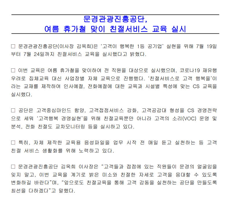문경관광진흥공단, 여름 휴가철 맞이 친절서비스 교육 실시