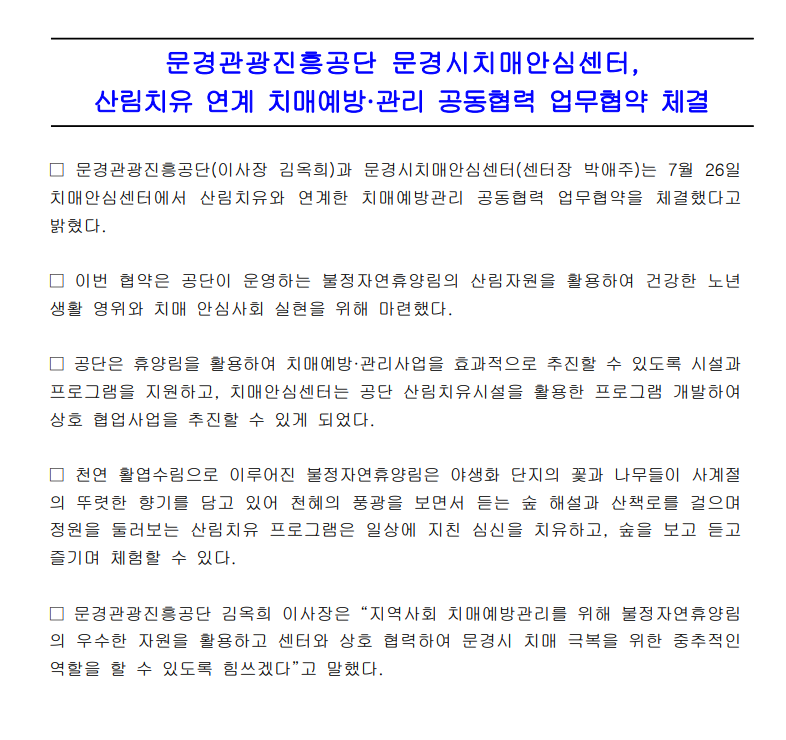 문경관광진흥공단, 문경시치매안심센터, 산림치유 연계 치매예방·관리 공동협력 업무협약 체결