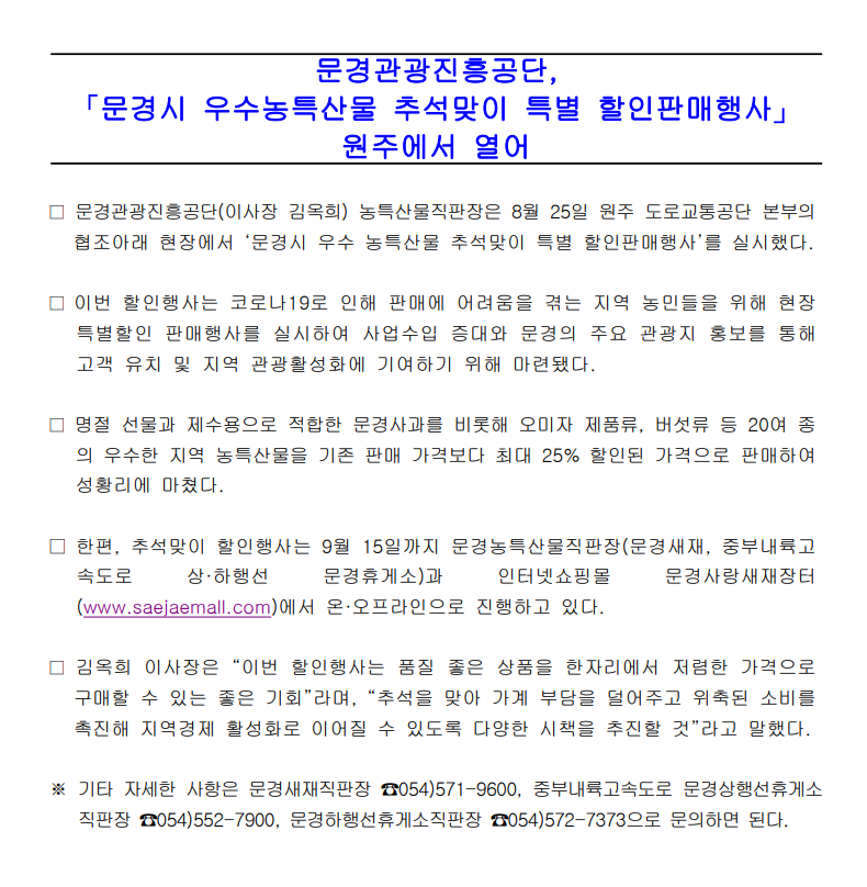 문경관광진흥공단, 「문경시 우수농특산물 추석맞이 특별 할인판매행사」 원주에서 열어