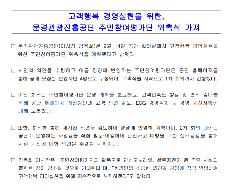 고객행복 경영실현을 위한, 문경관광진흥공단 주민참여평가단 위촉식 가져