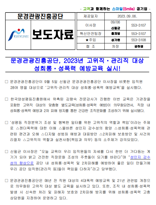 문경관광진흥공단, 2023년 고위직ㆍ관리직 대상 성희롱ㆍ성폭력 예방교육 실시!