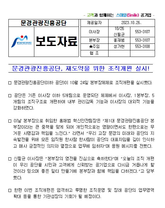 문경관광진흥공단, 재도약을 위한 조직개편 실시!