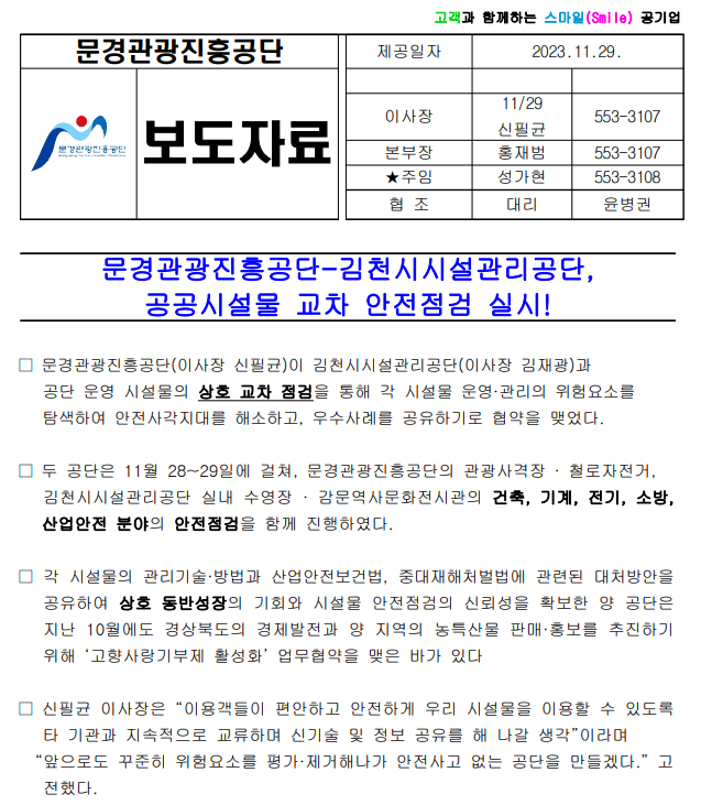 문경관광진흥공단-김천시시설관리공단, 공공시설물 교차 안전점검 실시!
