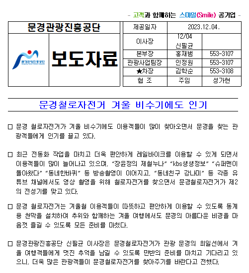 문경철로자전거 겨울 비수기에도 인기