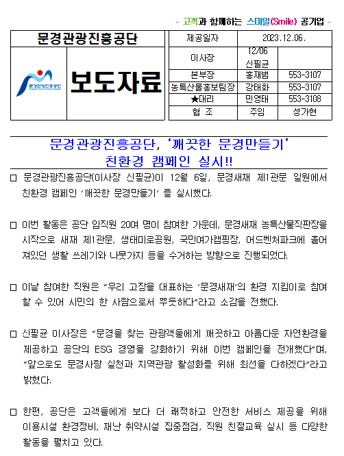 문경관광진흥공단, '깨끗한 문경 만들기' 친환경 캠페인 실시!!