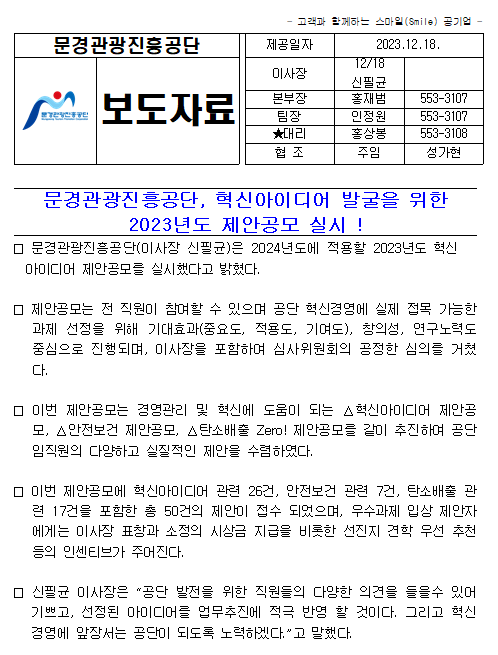 문경관광진흥공단, 혁신아이디어 발굴을 위한 2023년도 제안공모 실시!